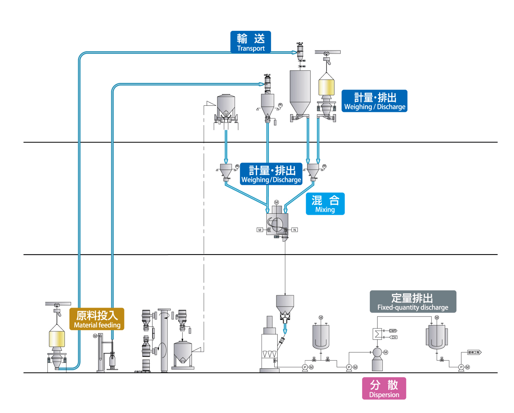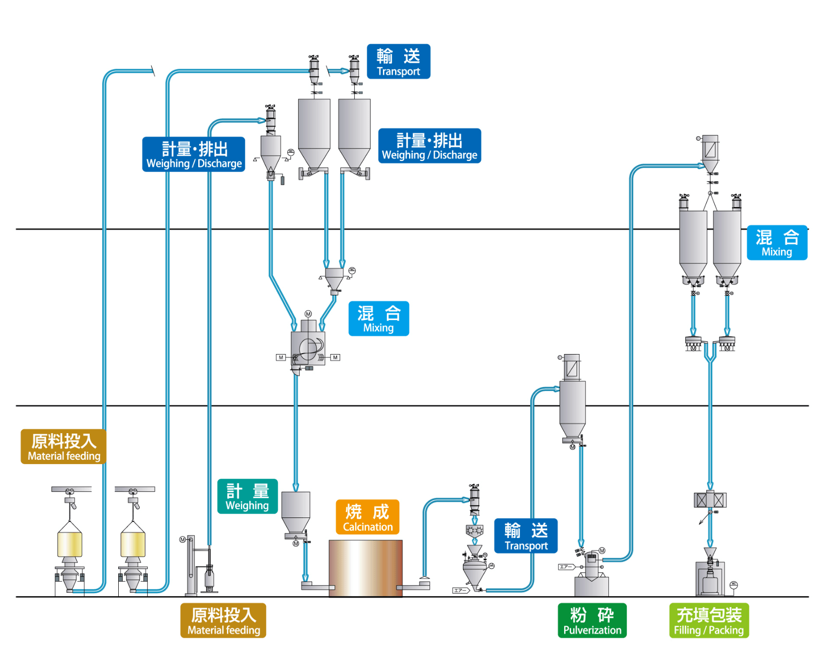 順應新能源產(chǎn)業(yè)的迅速發(fā)展,我們有豐富的電池相關(guān)的粉末處理經(jīng)驗,尤其擅長處理正極材料、負極材料和電解質(zhì)粉末,從原料的排出、輸送、計量、混合、粉碎、篩分、充填等,提案合適的設(shè)備方案。并為客戶提供“防止異物混入”和“耐磨損措施”的成套產(chǎn)線和設(shè)備。