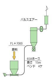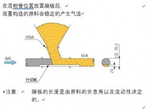 我們根據(jù)粉體特性把通過采用抽吸式空氣運輸方式(進入混相管)實現(xiàn)原料供應(yīng)的裝置選定為復(fù)式擋板。在這種情況下,預(yù)計可能存在因上游工段時間差導(dǎo)致原料在某一時間點大量供給到空輸管的情況。為了即使在這種情況下也能使空輸管不受阻礙從而實現(xiàn)穩(wěn)定的空氣輸送,我們在混相管位置做了改進。