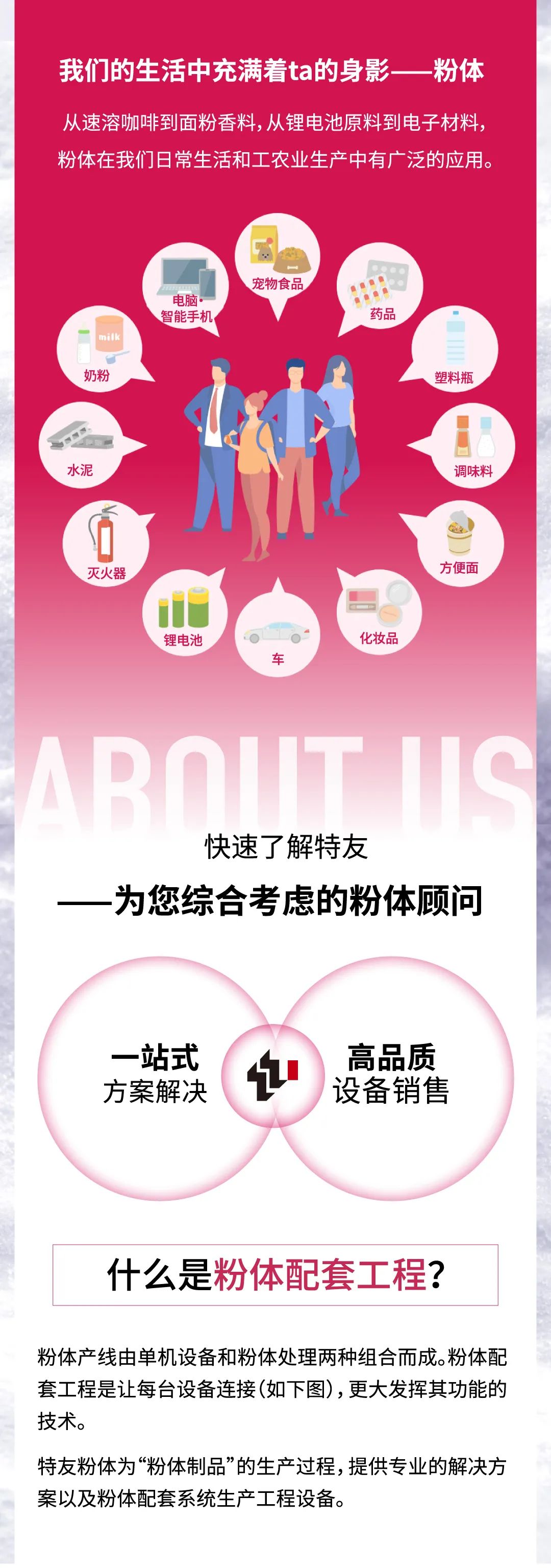 特友總公司東洋高科技于1964年創(chuàng)立,擁有「粉體系統(tǒng)工程業(yè)務(wù)」和「粉體機(jī)器的開(kāi)發(fā)和銷(xiāo)售」為一體的粉體設(shè)備經(jīng)驗(yàn)與技術(shù)。為中國(guó)、日本、美國(guó)、東南亞的企業(yè)客戶提供與有關(guān)粉體有關(guān)的設(shè)備服務(wù),幫助客戶解決了諸多生產(chǎn)難題。