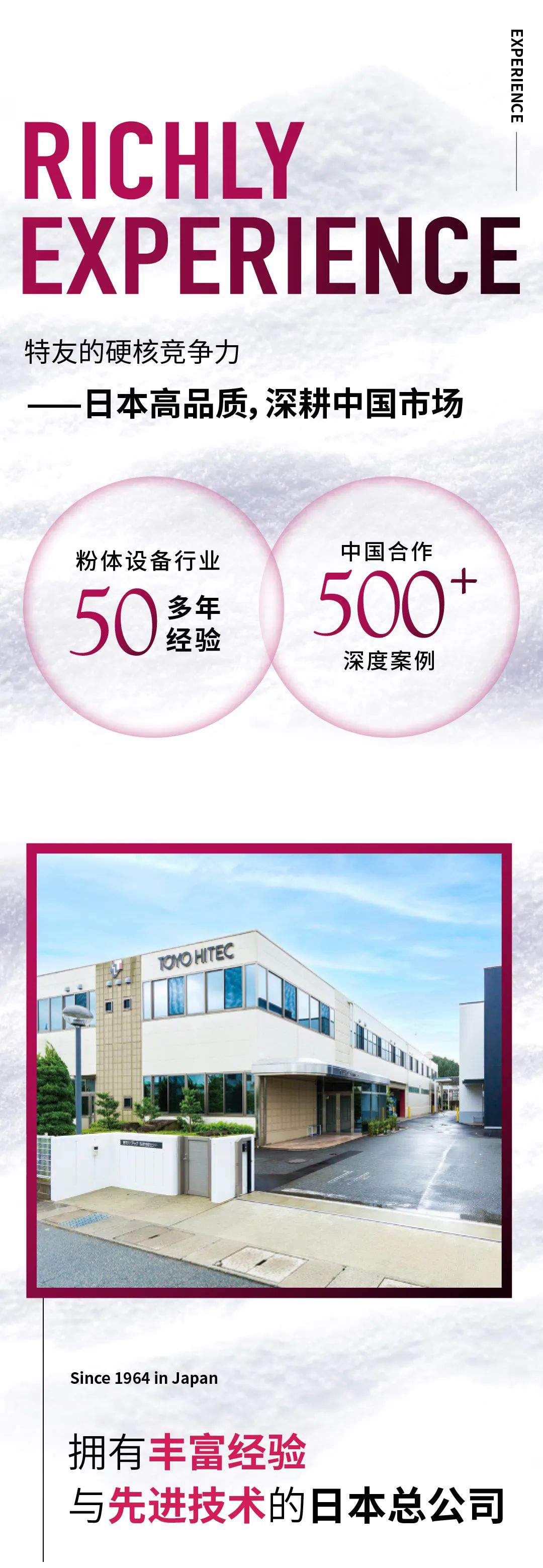 秉承日本總公司的50多年的粉體技術(shù)與經(jīng)驗(yàn),活用積累的豐富經(jīng)驗(yàn)并深耕中國(guó)市場(chǎng),致力為客戶解決各類(lèi)生產(chǎn)難題。